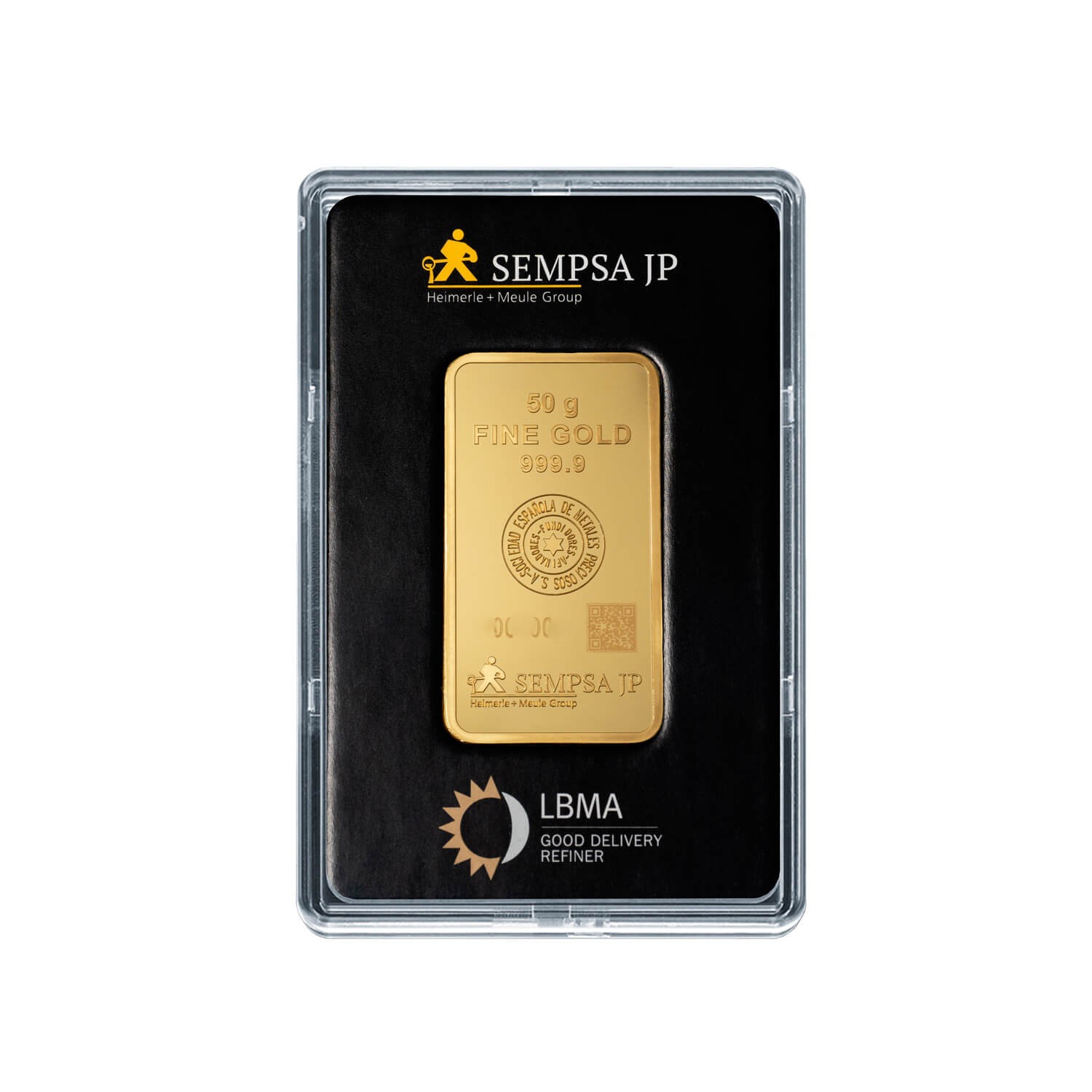 Blister con lingote de oro de 50 grs. Pureza 999.9 Marca SEMPSA.